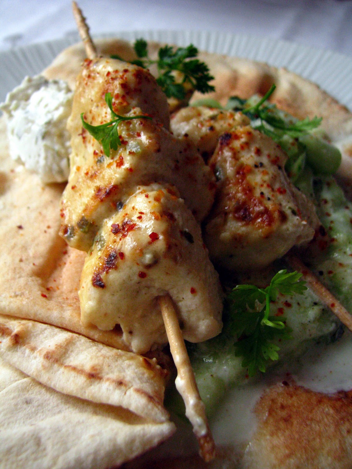 Cook chicken skewers with the marinade in a skillet over medium heat. Meanwhile, warm the Lebanese flat bread. To serve, arrange the patties on plates, divide the cucumber salad and kebabs. Sprinkle Espelette and have a teaspoon of Boursin Cuisine "shallots and chives" next. Serve immediately. Article sponsored