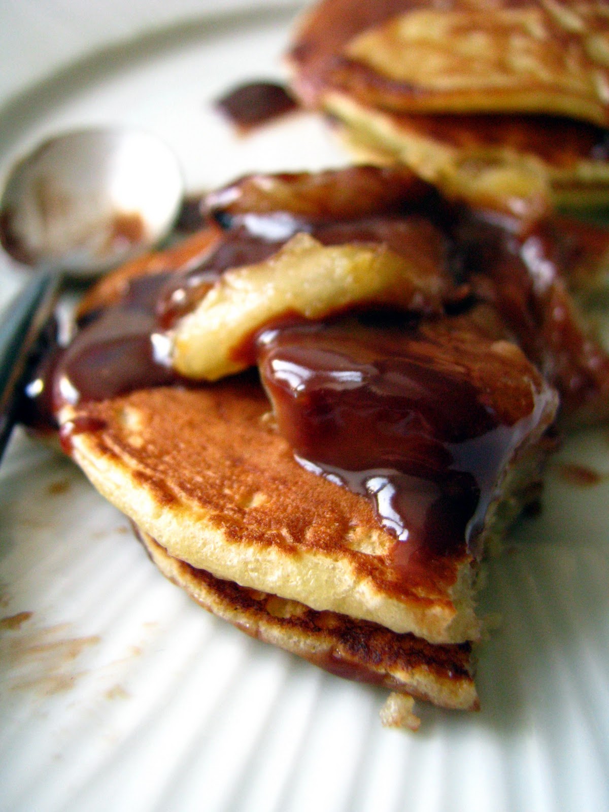 Place 3-4 pancakes on each plate, top with banana slices and pour the sauce over chocolate milk. Taste on.